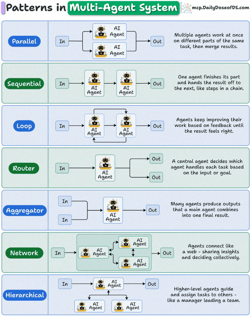 从理论角度看有不少多智能体的组织方式(甚至类似网络拓扑的感觉),比如ddd这张图就展示了7种:
