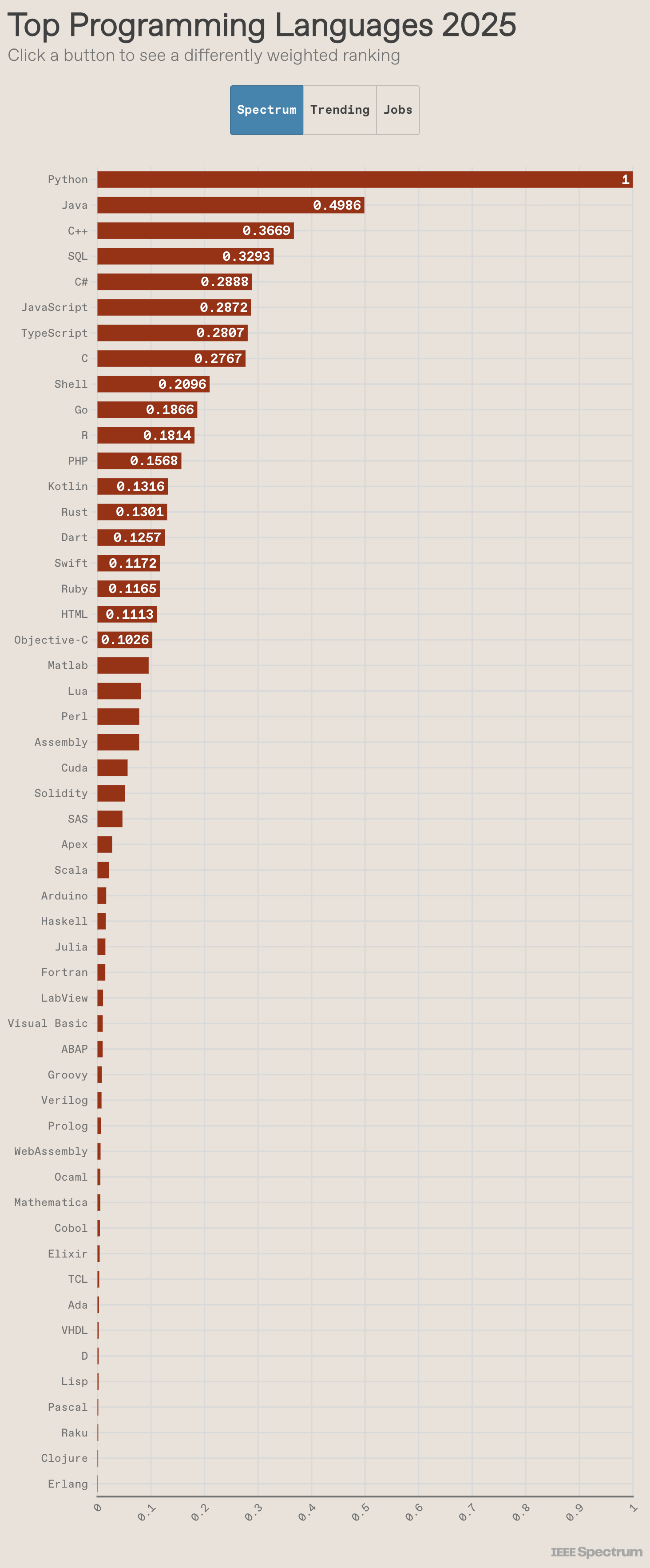 - The Top Programming Languages 2025:乘AI这股风的Python一骑绝尘。一个不错的观点:LLM的出现让一些新的编程语言几乎不可能流行,人们不再直接写代码,少量的示例和教程也不足以支撑AI学习这门新语言,因此新语言生成的代码效果会很差,下降螺旋。