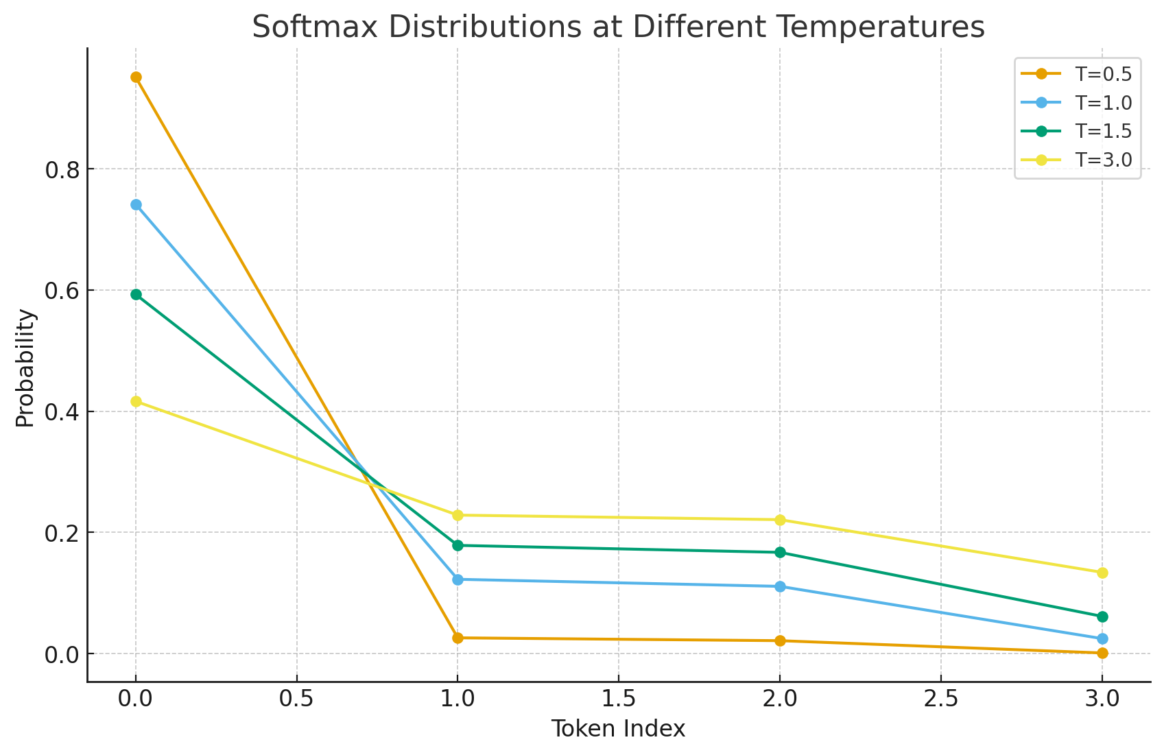 这些其实都涉及到了大模型的采样(Sampling)策略,这些内容可以影响模型的输出,甚至是输出风格,比如模型输出更具创造力还是,更加更倾向准确确定的方向。我们最多的应该是使用了Temperature来控制,我们知道大一点(比如1)可以输出更加创造性的内容,小一点(比如0.1)的可以输出更加准确的内容。这些其实都跟一个叫做Softmax有关