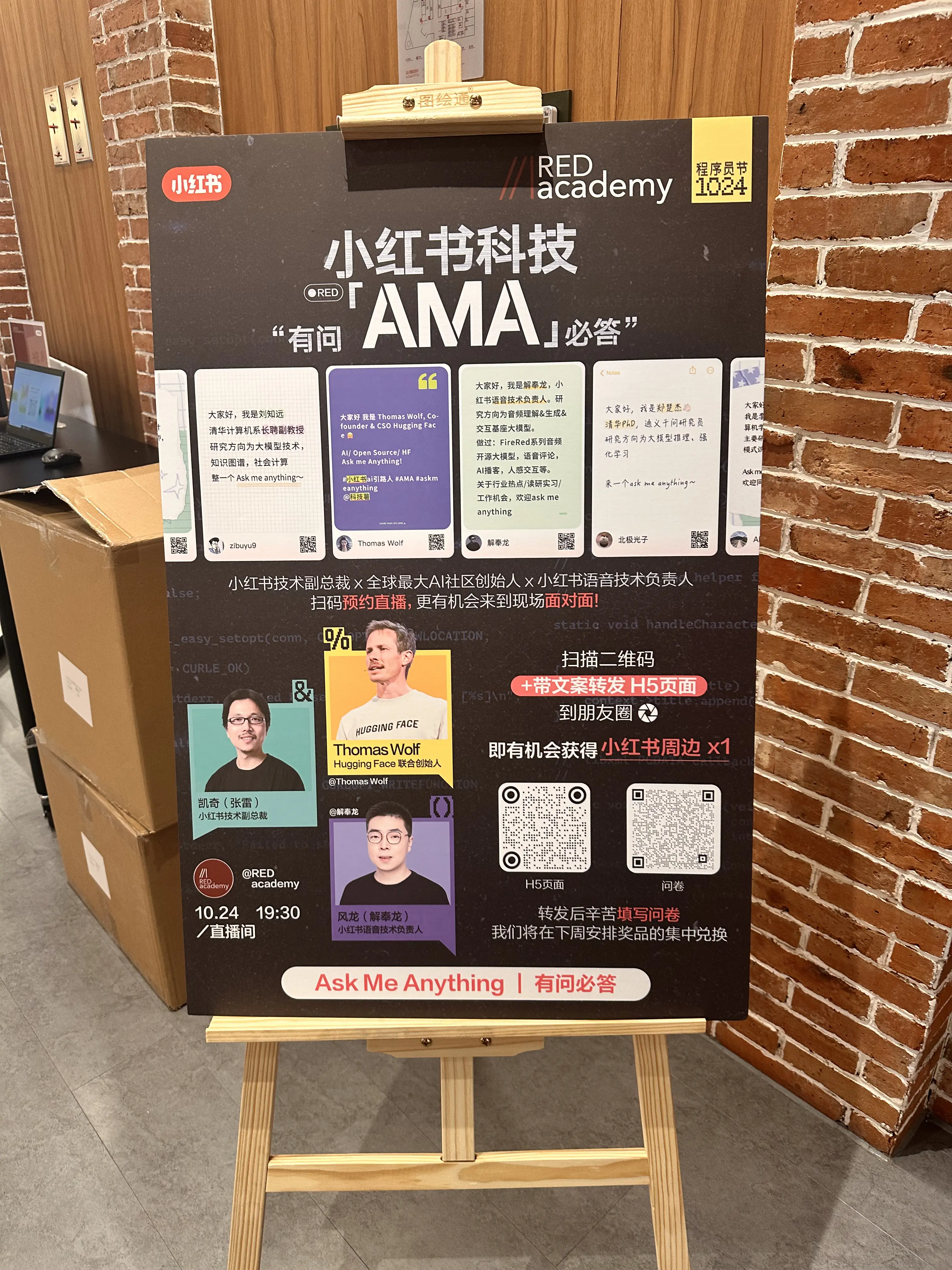 坐下后发现还配备了翻译机,回头看了一下隔音小屋子里有两位同声翻译员,一下子把level拉起来了。因为Thomas堵在路上(现实感受一下SH的周五晚高峰?),主持人小姐姐和两位小红书的两位老师热场中,倒是也让我们来访的人了解了一些小红书在内容、AI相关领域的一些咨询。Thomas到位后也正式开始了。这次的形式主要是QA,一趴是提前收集到的问题由主持人小姐姐发问,另一趴是现场观众提问。主持人小姐姐长得很好看,不过似乎访谈技巧还有一定的提升空间😊。另外感觉筹备组提前收集准备的问题似乎不完全make sense,不过问题倒也是不大,重要的还是听三位老师的字里行间的一些想法和见解。